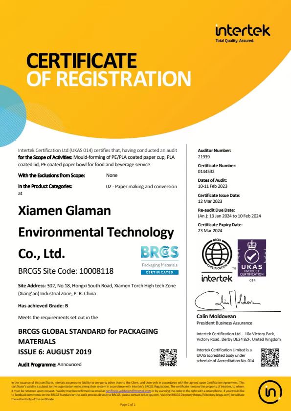 Für internationale Käufer kann die Beschaffung sicherer und zuverlässiger Verpackungen ein Problem darstellen. Hier kommt die BRC (Globale Standards zur Einhaltung der Markenreputation) Die Zertifizierung kommt ins Spiel. Als führender Hersteller von biologisch abbaubare Einweg-Lebensmittelbehälter aus Papier Xiamen Glaman Environmental Technology Co., Ltd. hat ihre Produktionswerkstatt nach den höchsten BRC-Standards errichtet.
